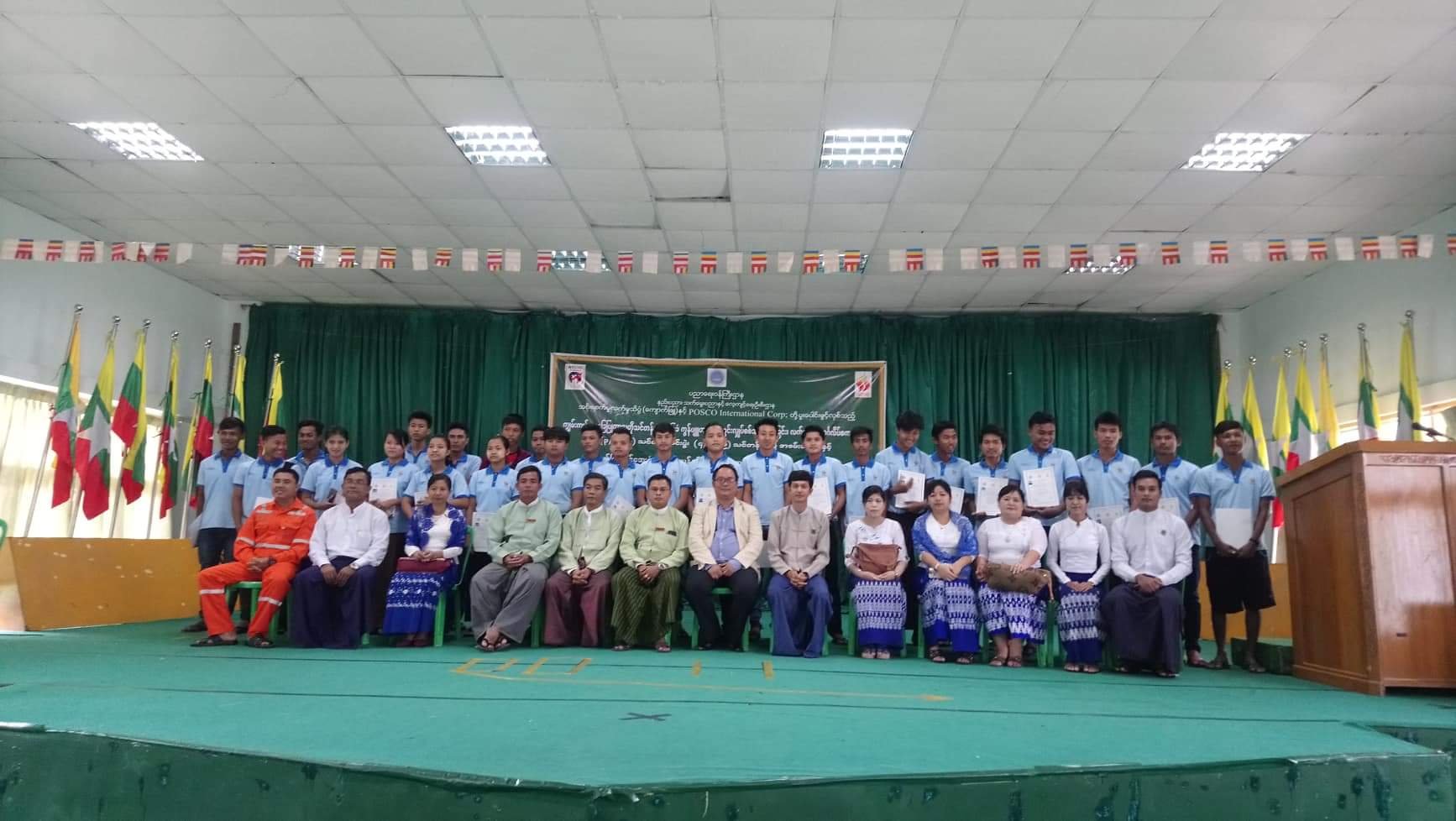 The closing ceremony of skills-oriented short-term courses 3/2019 and 4/2019, jointly organized by Government Technical Institute ( Kyaukphuy) and POSCO International, were held at Rammawaddy hall in the town of Kyaukphyu, Rakhine state this morning.