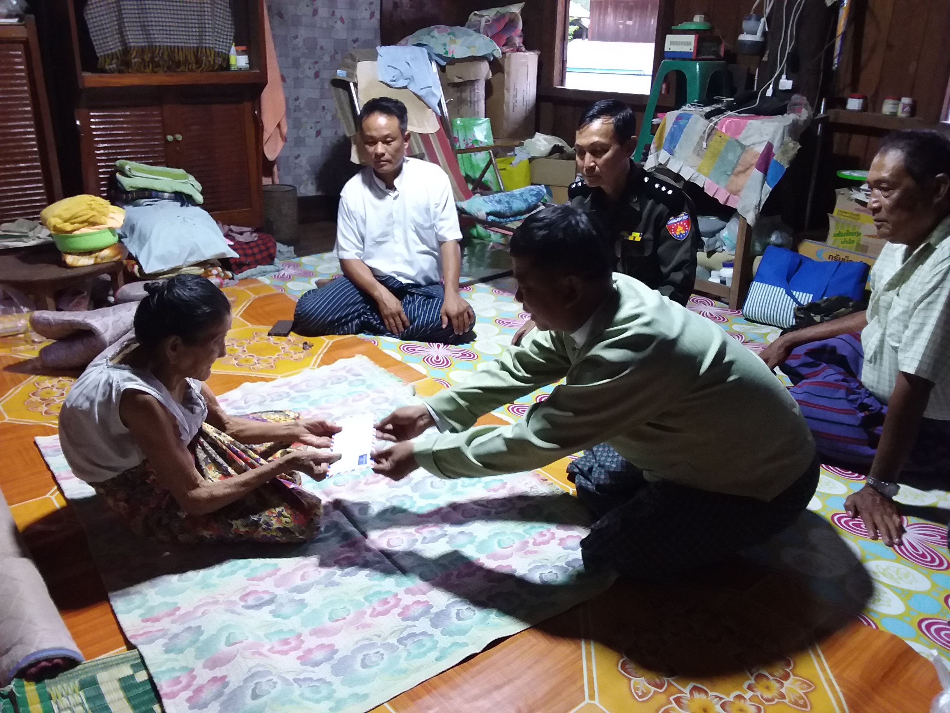 The Department of Social Welfare under the Ministry of Social Welfare Relief and Resettlement is making provision projects to the elderly above 85-year old, pregnant women and children under two-year old. The officials in the Township made a domiciliary visit to provide social pension for three months. The social pension is designated K 10,000 per month.