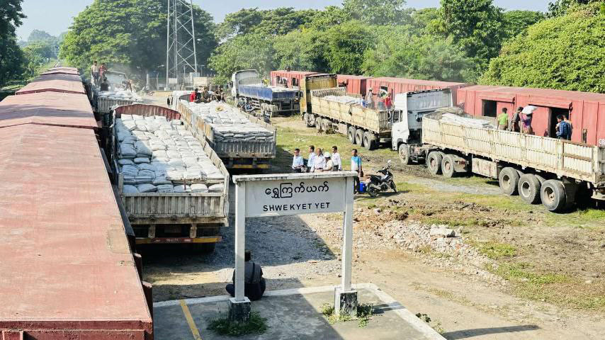The train, carrying a total of 9,720 bags of cement weighing 486 tonnes, arrived at Shwekyatyet Station in Mandalay yesterday morning. Responsible officials inspected the consignment. The cement will be distributed for use in rehabilitation and reconstruction projects across the Region.