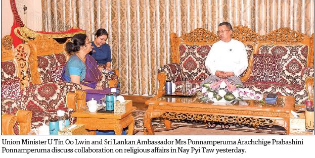 Union Minister for Religious Affairs and Culture U Tin Oo Lwin received Mrs Ponnamperuma Arachchige Prabashini Ponnamperuma, Ambassador of Sri Lanka to Myanmar, in Nay Pyi Taw yesterday.