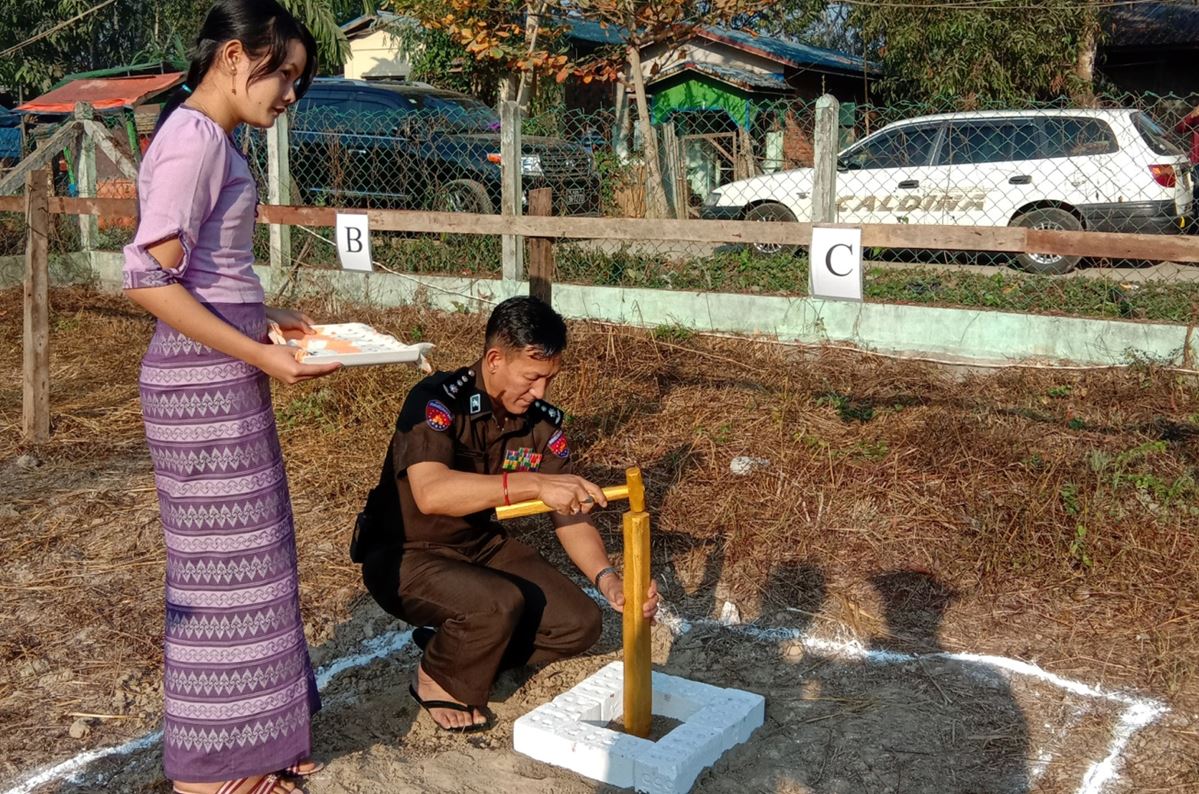 Afterwards, Daw Moe Moe Su Kyi, the region Hluttaw Representatives U Aung Phone Kyaw San Oo and U Htay Maw, staff officer of the region Immigration and Population U Saw Naing and U Chit Tun from Shwe Yadana Myaing Company drove the stakes at the designated places of the construction site and sprinkled scented water on it.