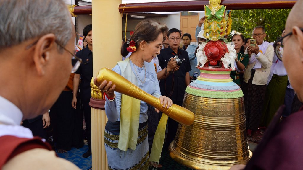 Daw Aung San Suu Kyi, who is also the Chairperson of the Central Committee for Development of Border Areas and National Races, attended the consecration ceremony of the Thitsa Aung, Myitta Aung, Pyinnya Aung pagoda inside the compound of Dipinkara Monastery in Natmauk yesterday.