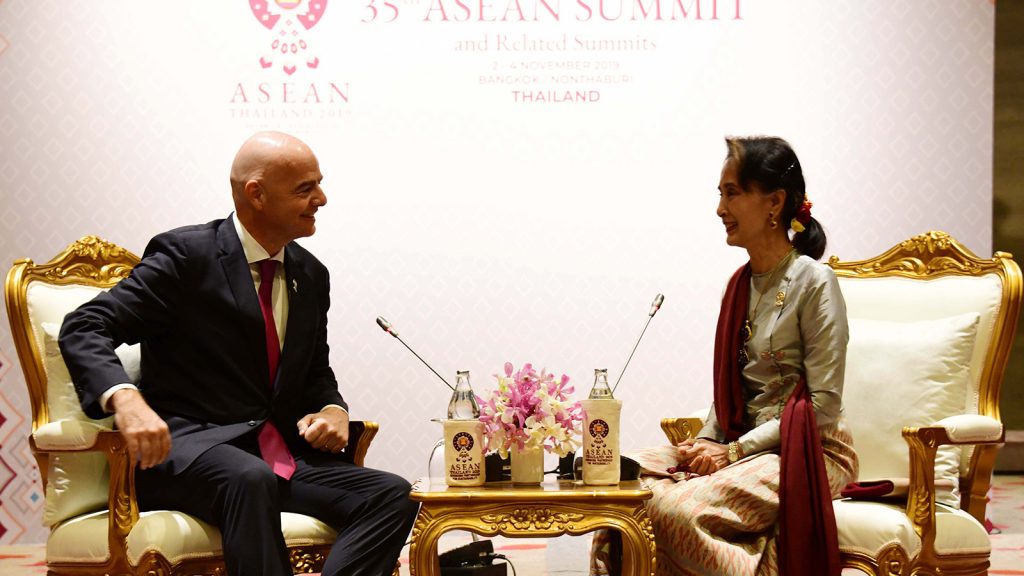The State Counsellor requested assistance from FIFA president to further enhance youth’s interest in sports, introduce a healthy lifestyle, promote team spirit and help Myanmar football to reach the top Asian ranking.