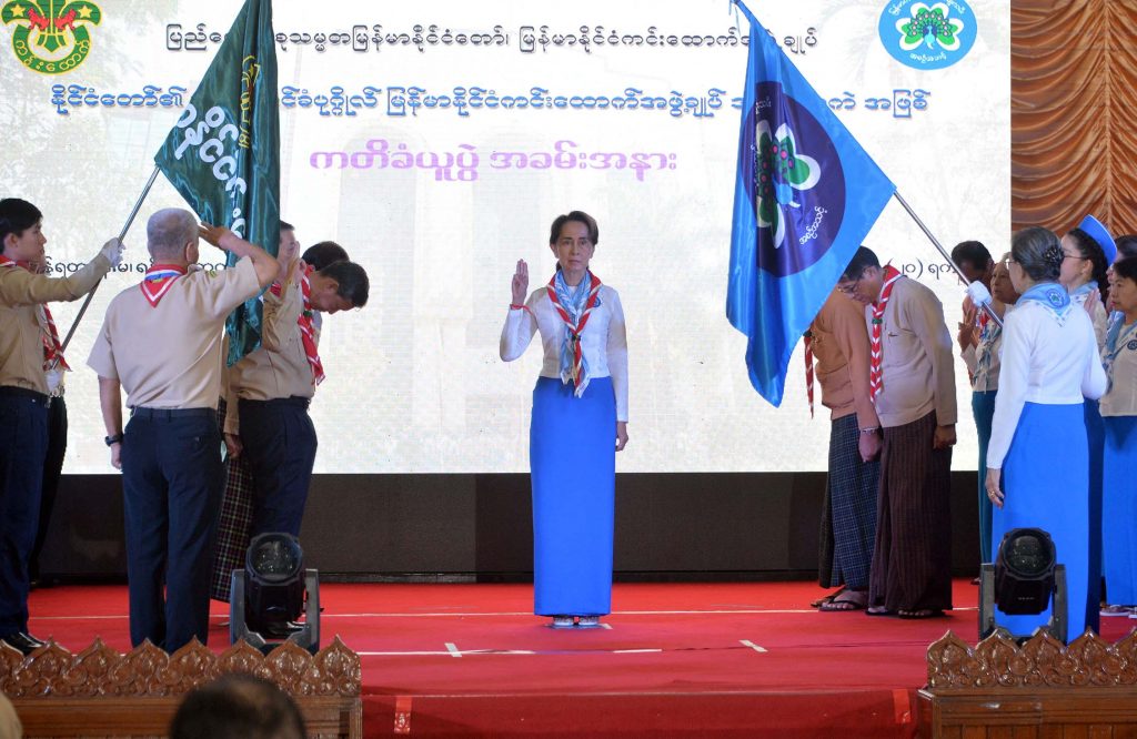 I noted with joy and happiness that the standards, norms and values that were taught to us when young had remained in our hearts. The reason why I wanted to support the Scout movement was to put the young the scouts/guides onto a good path beginning from a young age when their minds and thoughts were still young and unformed. This would be beneficial to them for life. I believed that this would be beneficial for us as well as for our society. The scout movement held their meetings weekly in groups. Facts about scouts/guides were taught to us by our teachers. To come together as a group was not for teaching only but for enjoyment also. We had an opportunity to make new friends. We learnt songs that were informative for us. Yesterday was Martyrs Day when an interfaith prayer service was held as usual every year and the religious song sang at the service was the song that I was taught in the Scout/Guide group. We were straight and honest due to the faith we had and this was taught by the song and remains valued within us. I also understood the importance of a Scout/Guide when I was sworn-in as Head of the Myanmar Scout Federation, said the State Counsellor.