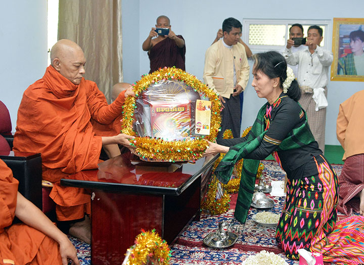 State Counsellor Daw Aung San Suu Kyi donated Waso robes to the leading monk of Aung Zabu Pariyatti Monastery in Sinchan Village of Peindegone Village-Tract in Kawhmu Township, Yangon Region, yesterday morning.
