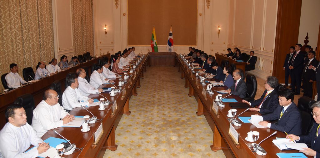 Together with the State Counsellor, the meeting was also attended by Union Ministers U Kyaw Tint Swe, Dr Pe Myint, U Min Thu, U Thant Sin Maung, Dr Than Myint, Dr Myo Thein Gyi, U Soe Win, U Thaung Tun and U Kyaw Tin, Myanmar Ambassador to ROK U Thant Sin and ROK’s Ambassador to Myanmar Mr Lee Sang-hwa.