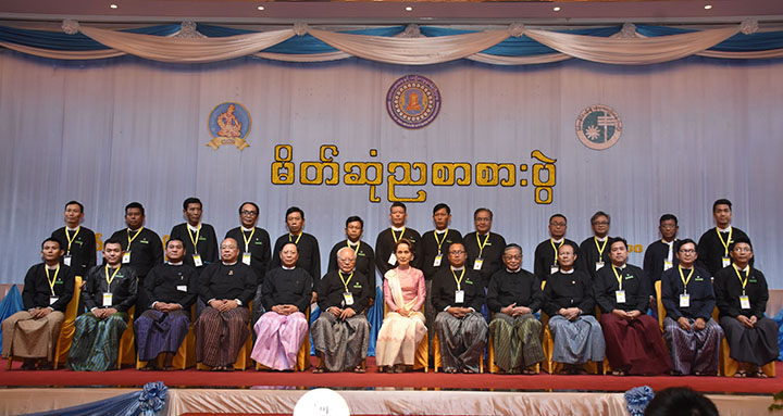 Firstly, the State Counsellor had a commemorative photo taken with all in attendance. Union Religious and Cultural Affairs Minister Thura U Aung Ko then gave a short speech where he explained the history and objectives of the Myanmar Calendar Advisory Group, the Myanmar Central Thabin Association, and the Myanmar Arts and Crafts Association. He said these three organizations were invited to voice their opinions for future plans to the State Counsellor during this meeting. He said the State Counsellor would ask questions on what she wished to understand deeply and provide appropriate suggestions and instructions as necessary.