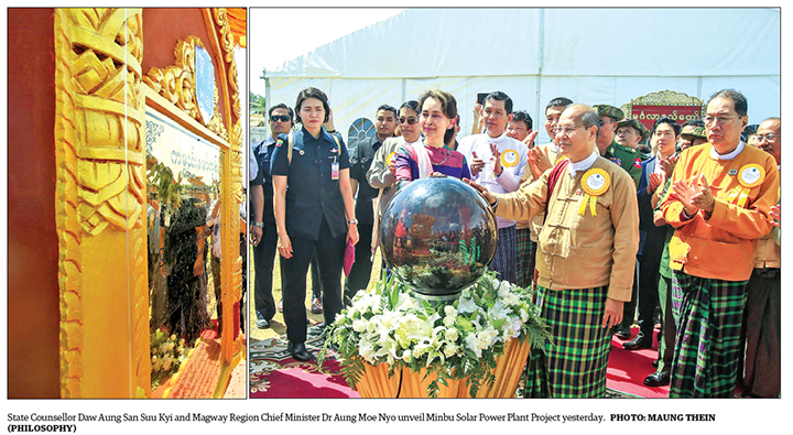 State Counsellor Daw Aung San Suu Kyi inaugurated the first phase of a solar power plant project in Minbu yesterday, adding 40MW of power generated by the plant’s first phase to the national grid.
