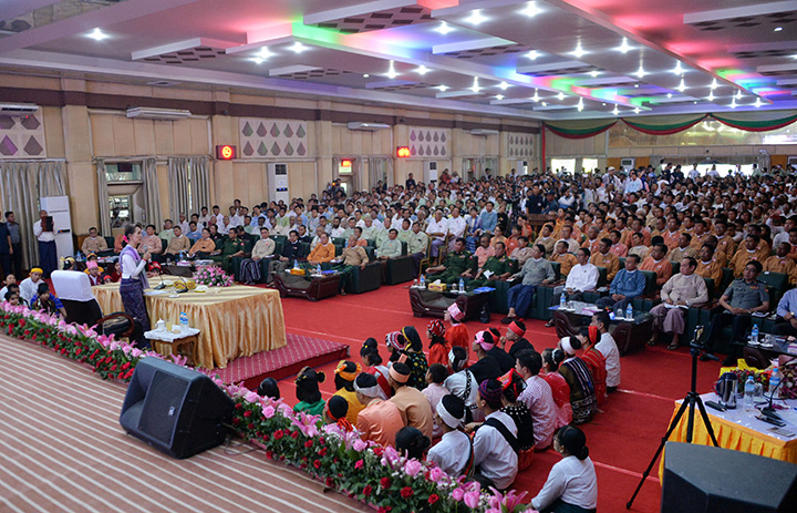 State Counsellor Daw Aung San Suu Kyi, the Chairperson of the Central Committee for Development of Border Areas and National Races together with Union Ministers Lt-Gen Kyaw Swe, Lt-Gen Ye Aung, U Min Thu, Dr. Aung Thu, U Ohn Win and Dr. Myint Htwe and officials met with people of Magway at Magway Town Hall yesterday afternoon.