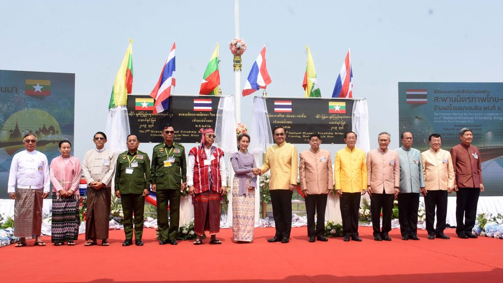 After delivering the speeches, State Counsellor Daw Aung San Suu Kyi and Thai Prime Minister Prayut Chan-o-cha unveiled a plaque commemorating the successful completion of the Myanmar-Thai Friendship Bridge 2 by pressing a button.