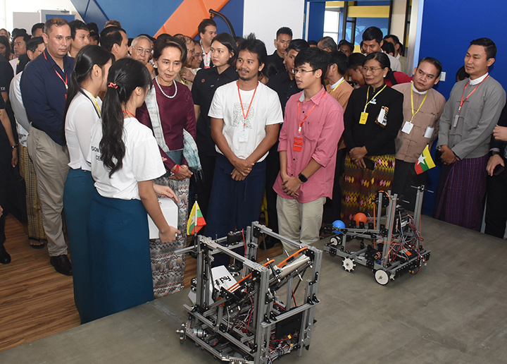 Moreover, the State Counsellor said, “It is needed to support innovators as much as possible. I also hope the Yangon Innovation Centre could help develop new innovations for the country steadfastly. The government will support with policies and arrangements as we cordially invite universities, research and renovation centres, partner-organizations, well-wishers and businesspersons at home and abroad to help in the creations of our young people.