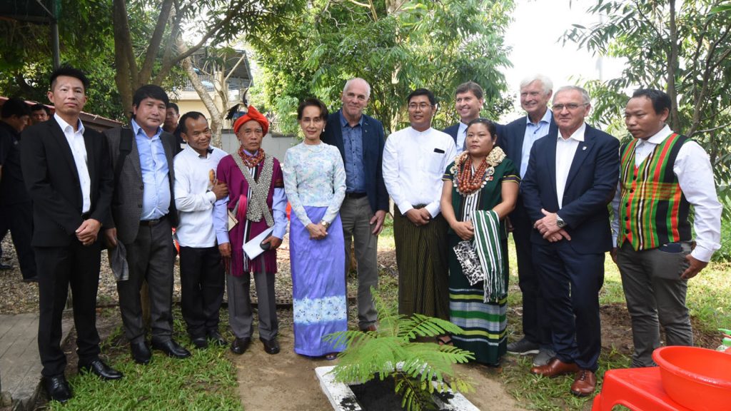Next, the State Counsellor, Froland City Mayor and park executive committee chairman exchanged gifts and executive committee chairman presented the State Counsellor with a park history book. Afterwards the State Counsellor and the party led by the Froland City Mayor and park executive committee chairman planted a Myanmar-Norway Friendship Tree in the compound.