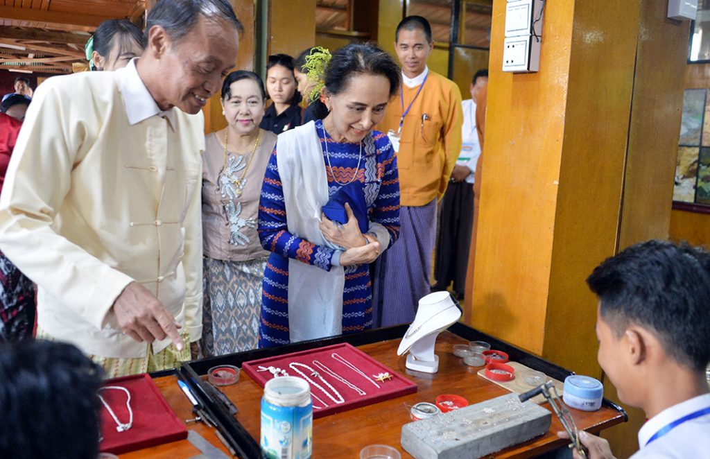 State Counsellor Daw Aung San Suu Kyi visited the Inle Heritage Foundation and the Khit Sunn Yin Lotus, Silk and Cotton Hand Weaving Centre in Innpawkhon Village, and the Sein Thamadi Gold and Silver Smith Industry in Heya Ywama Village in Nyaungshwe Township in southern Shan State yesterday.