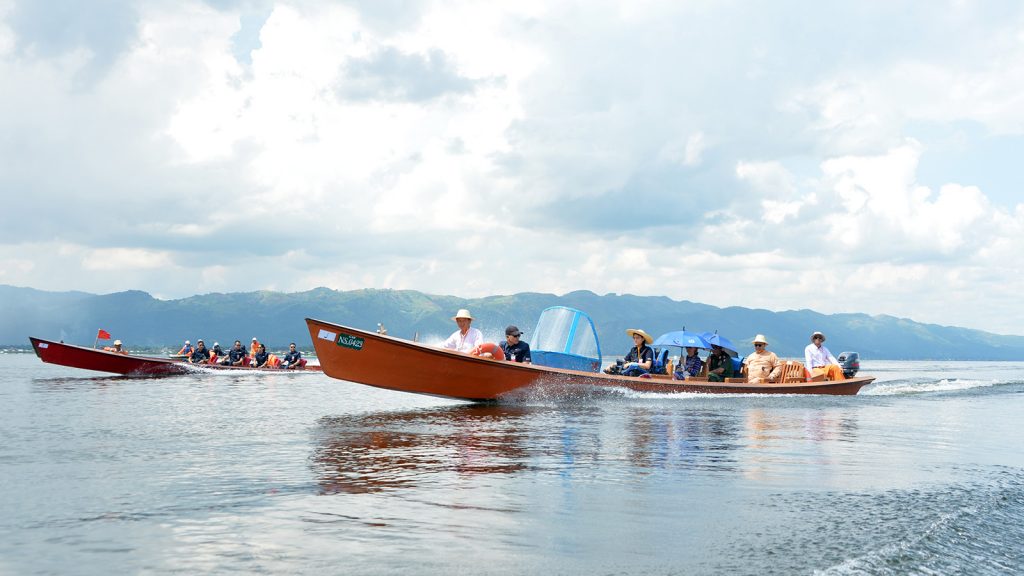 The State Counsellor and party observed the conservation of Inle Lake by motorboats.