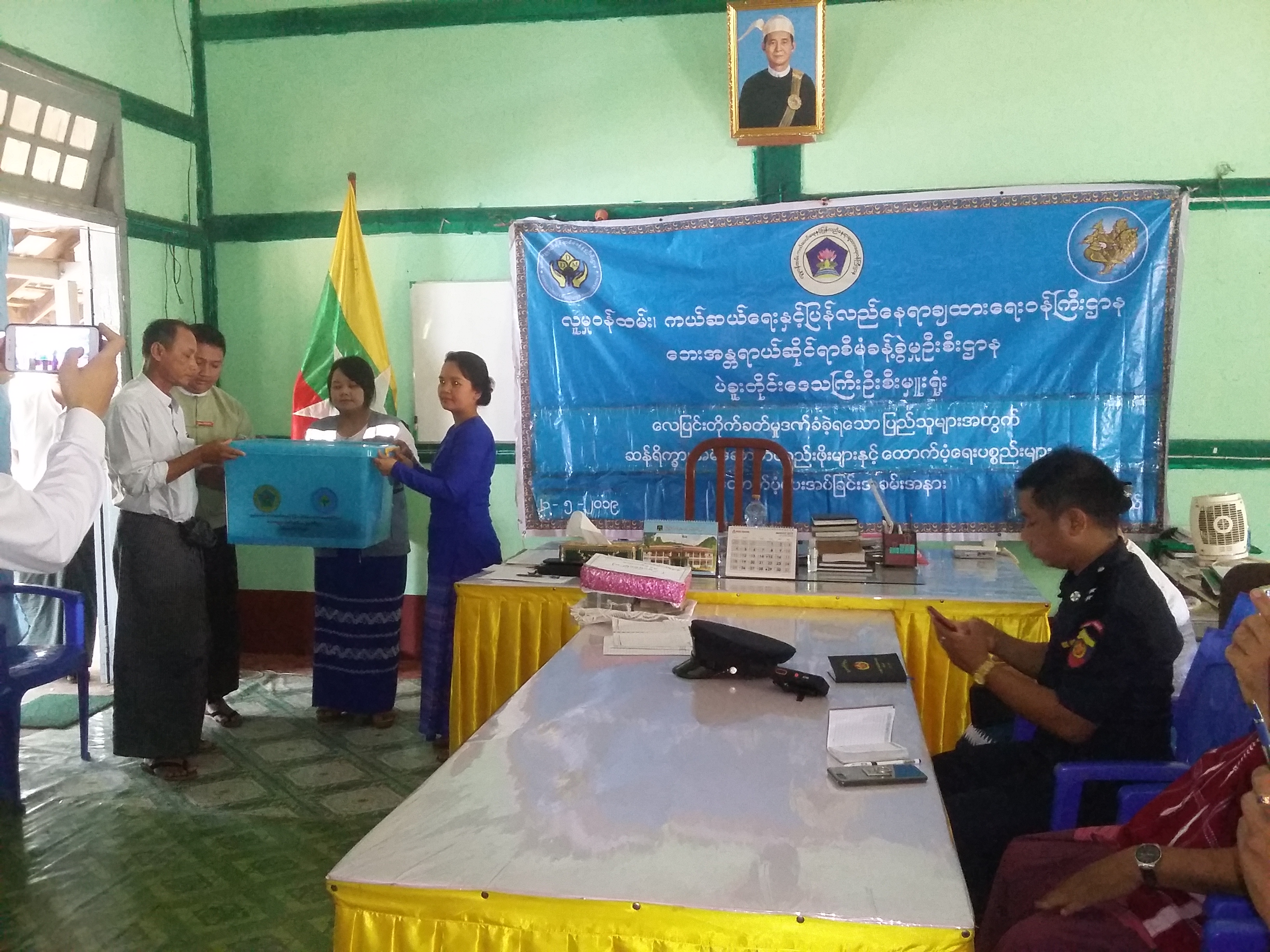 A ceremony to present relief supplies to storm victims was held at the office of the General Administration Department in Letpadan Township, Bago Region this morning.