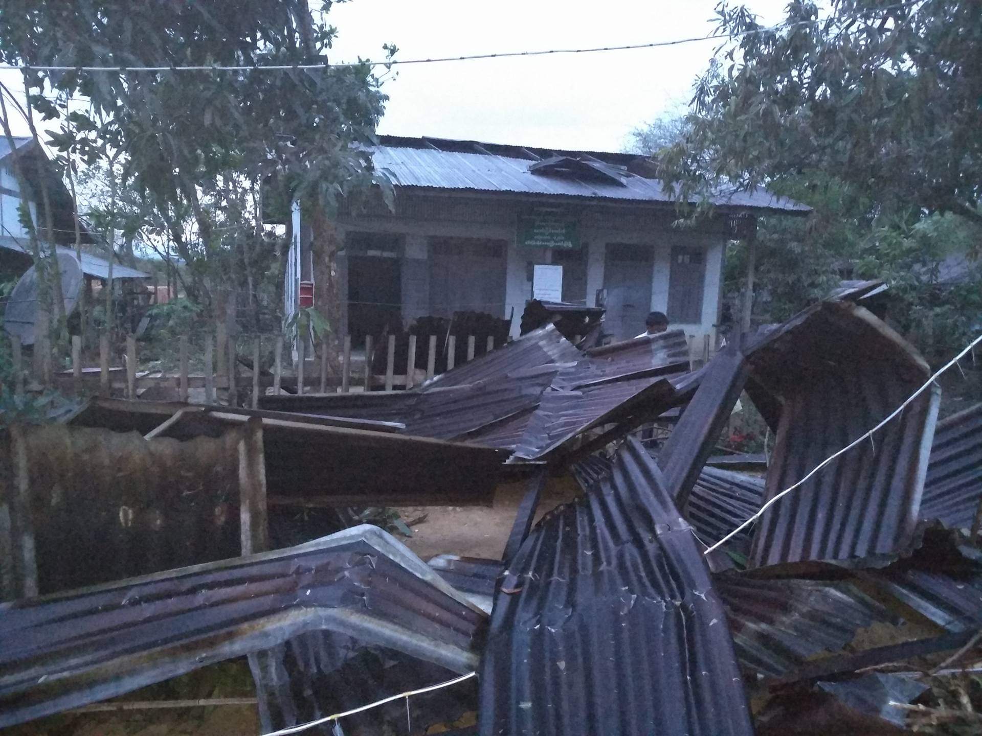 The strong winds hit Paungbyin, Mawlaik District on 2 April. The strong winds caused the roofs of departmental offices, pagodas, houses and school buildings to flip over. A one-storey pavilion of a pagoda collapsed in the gusts of wind.