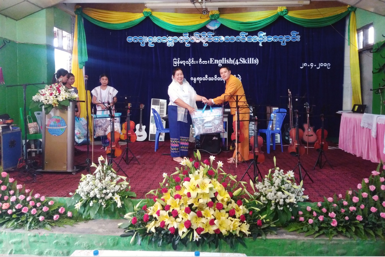Afterwards, Saya U Myint Oo, a martial arts instructor from University for the Development of the National Races of the Union, explained about the Myanmar martial arts. Then, trainees in musical course performed their skills in violin. After that, students who attended English language proficiency course performed their skills in English and students from Kyezu Kabar Private High School performed Myanmar martial arts at the basketball ground in the compound of the School.