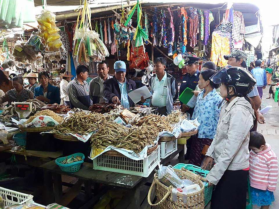Officials from the Township Department of Consumer Affairs, Township Public Health Department, Township Fire Services Department, Township Development Committee and members of Market Committee and ward administrators jointly inspected whether “words” bearing expired dates are printed in Myanmar. In addition, they warned the shopkeepers of avoiding the sales of prohibited goods and shared awareness on selling goods permitted by FDA and distributed pamphlets.