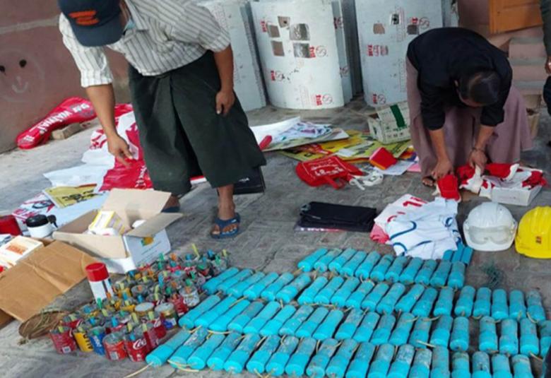 The combined security forces conducted a patrol at the corner of 30th and 63rd streets in Pyigyimyathman Ward of Chanayethazan Township on 8 December. During the patrol, they examined Khine Zin Zuu and seized pamphlets and one cloth bearing letters for ‘Silent Strike’. Then, they raided her house in Pyigyimyathman Ward of Chanayethazan Township and seized 100 homemade mines, 33 gunpowder cords, 30 shields, three bullet-proof vests, one Bakatha flag with peacock logo, various kinds of medicines and other materials used in protests.