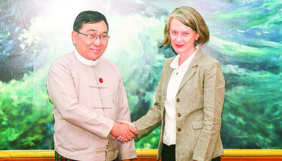 UNION Minister for Social Welfare, Relief and Resettlement (SWRR) Dr Win Myat Aye received Ambassador of Australia to Myanmar Ms Andrea Faulkner at minister office May Kha Lar hall in Nay Pyi Taw yesterday morning.