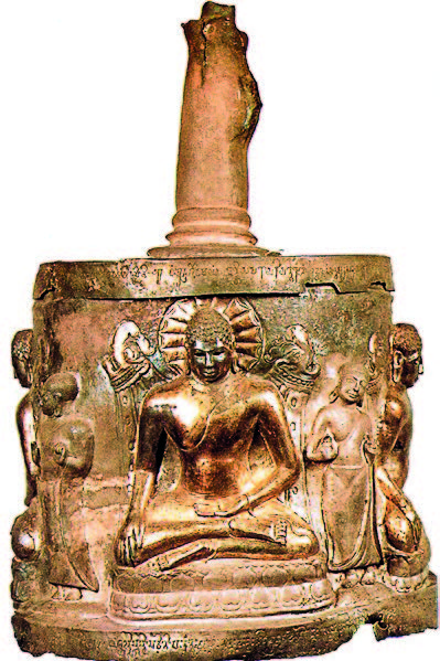 Numerous socio-political ideas are reflected in Buddhist monuments across India, Sri Lanka, Thailand, and Myan­mar. At various Buddhist sites in India, such as Kapilvastu in Nepal, original mud Buddhist structures have been discov­ered. These structures were often enlarged and encased with bricks or stones by sub­sequent donors to ensure their longevity and durability, reflect­ing the socio-political ideas of the time. Inscribed reliquaries, such as those found at the Pip­rahwa and Bhattiprolu stupas, reveal insights into the relics of the Buddha. Similarly, reli­quaries from Stupa 3 at Sanchi and Stupa 2 at Satdhara contain inscriptions regarding the relics of the Buddha’s chief disciples, Sariputta and Mahamoggallana. Additional inscribed reliquaries discovered at Sanchi Stupa 2 and other Bhilsa Tope sites relate to a group of Hemavata teachers led by an individual named Goti­puta, providing valuable insights into religious and socio-political ideas.