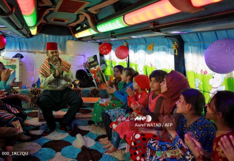 The ceiling is too low for the teacher to stand fully upright but Hussein Ali Azkour, a young boy wearing a yellow T-shirt, is enthusiastic about his classroom-on-wheels.