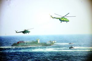 Navy seals gave a demonstration of raiding an enemy-seized passenger and trading ship and rescuing hostages by using four fast patrol crafts and three helicopters.