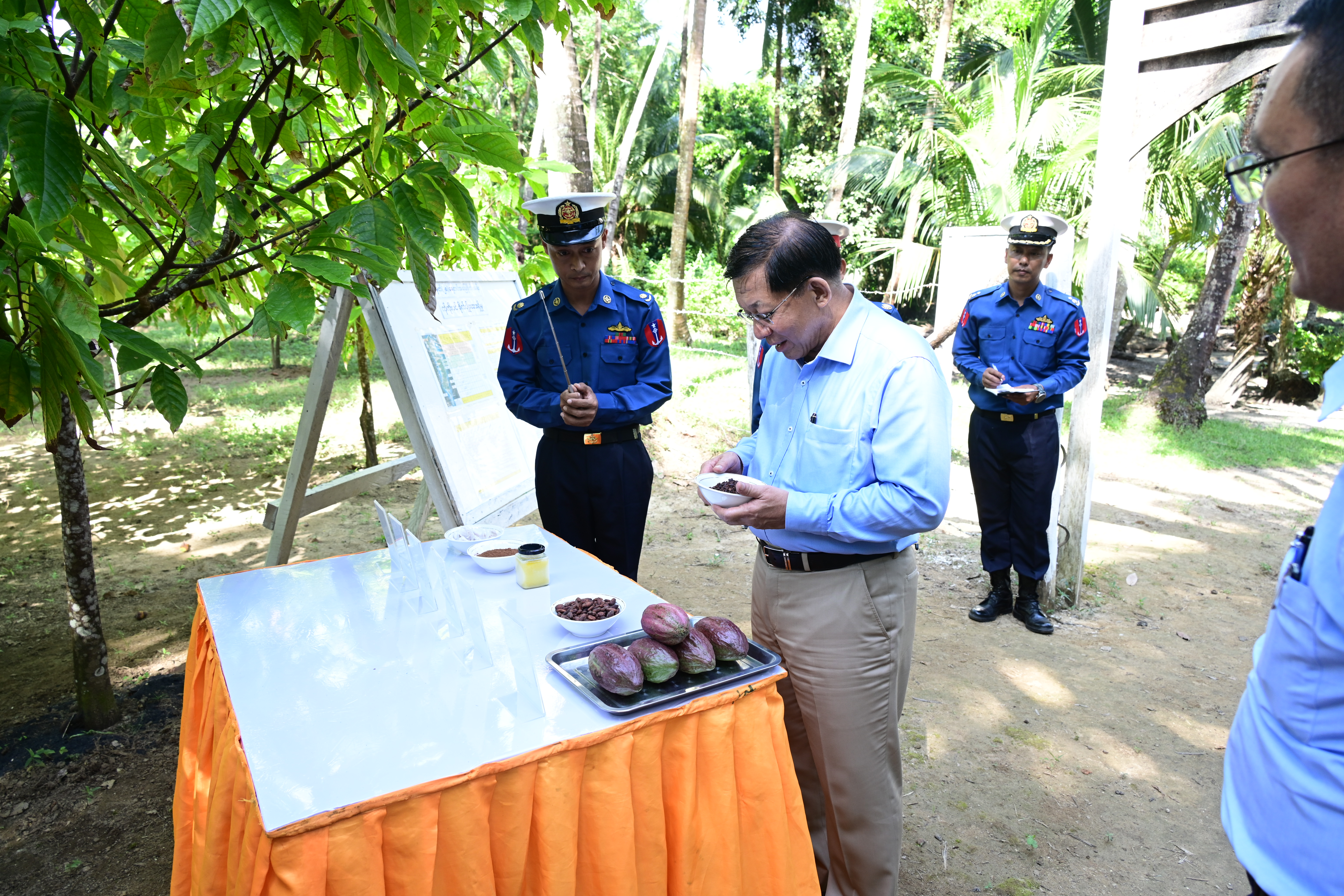 The Senior General observed thriving cocoa plants at the cocoa farm of the local naval region command headquarters and guided officials to expand cultivation of more cocoa plants and initiate the test-cultivation of Robusta coffee plantations. — MNA/TTA