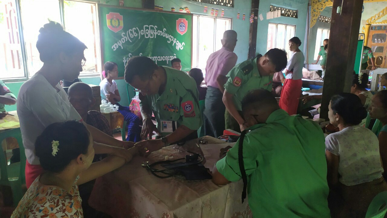 A Tatmadaw mobile medical team under No(66) Light Infantry Division led by Lt. Col Phyo Wai Lat in collaboration with two health staff from Kayin chaung rural health center provided free healthcare services to local people from villages in Kayin chaung village-tract and nearby villages at Cittathukha monastery in Kayin Chaung Gone village, Moenyo township, Thayawady district, Bago region this morning.—Aung Min Naing(IPRD)