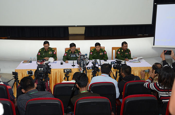 The Tatmadaw True News Team held a press conference at the Defence Services Museum in Nay Pyi Taw yesterday morning, on the issues of armed clashes with TNLA group in northern Shan State, seizures of arms and ammunition, activities of AA armed group in Rakhine State and confiscations of narcotic drugs in respective commands.