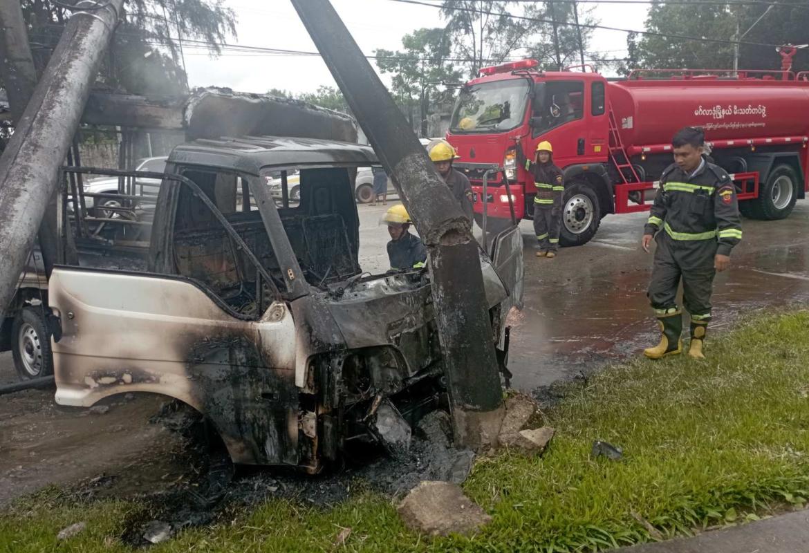 Vehicle Catches Fire after Hitting Lamp Post in Mingaladon Township