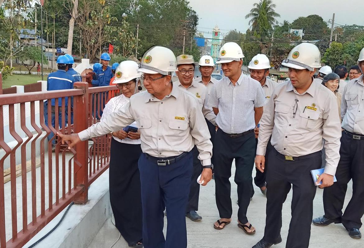 Union Minister for Construction U Han Zaw inspected Pathein Bridge (2) construction project before he looked into upgrade of Yangon-Pathein motorway on 29 February.