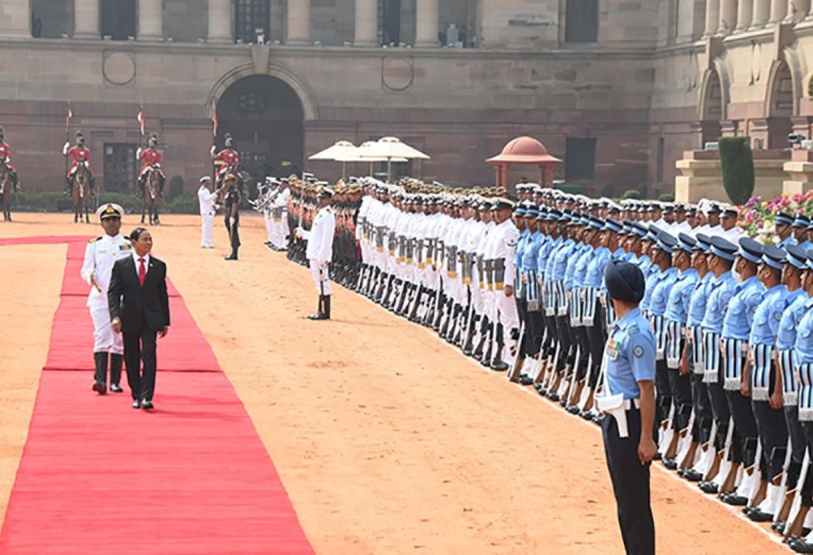 President U Win Myint and First Lady Daw Cho Cho attended a ceremonial welcome of India’s President Shri Ram Nath Kovind in New Delhi, the capital of India, yesterday.