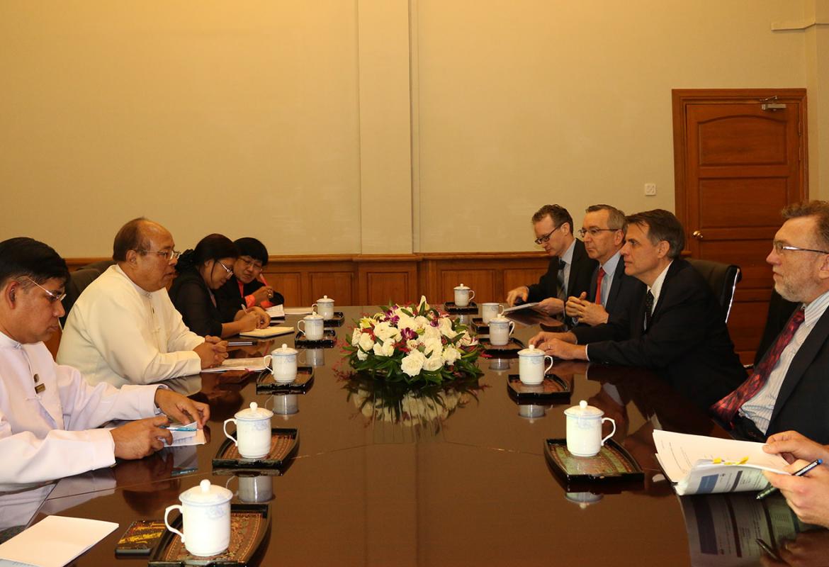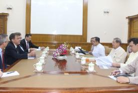 Union Minister for Planning, Finance and Industry U Soe Win received Deputy Assistant Secretary of the US Treasury for Asia Mr Robert Kaproth and US Ambassador Mr Scot Marciel at his office in Nay Pyi Taw yesterday.