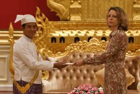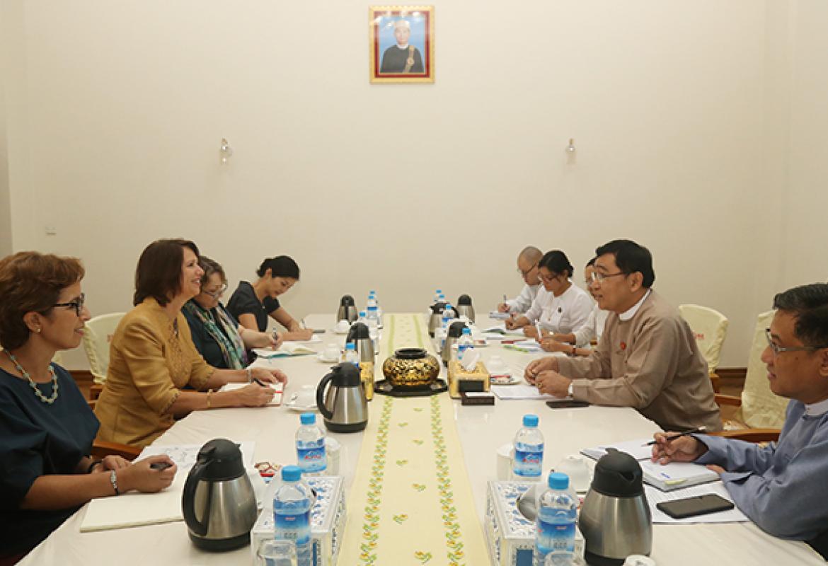 Union Minister for Social Welfare, Relief and Resettlement Dr Win Myat Aye received Ms Christine Schraner Burgener, Special Envoy of the UN Secretary-General to Myanmar, at his office in Nay Pyi Taw yesterday.
