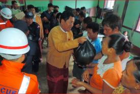 Officials from Kayin State Government led by Daw Nan Khin Htway Myint, Kayin State Chief Minister provided relief items to flood victims who are taking shelter at a temporary relief camp in Kyundo B.E.H.S, Kawkareik Township, Kayin State yesterday.