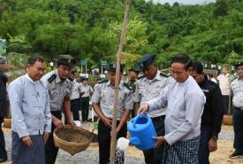 President U Win Myint planted a mahogany tree during a monsoon tree planting event held under the 2019 natural environment restoration and rehabilitation activity at Pho Zaung Taung Forest Reserve block 22 beside Nay Pyi Taw-Tatkon Road 1 in Nay Pyi Taw Ottarathiri Township yesterday morning.