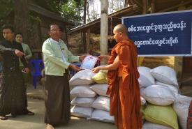 Representatives from the Rakhine State Peace & Stability Supporting Committee donated relief supplies to internally displaced persons at temporary rescue camps in MraukU Township, Rakhine State this morning.