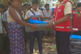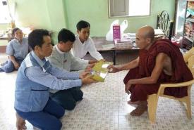 Officials from the Myaungmya District Disaster Management Department, Township General Administration Department provided cash aid to the monastery affected by fire in Kanyingone village-tract, Myaungmya Township, Ayeyawady Region yesterday.
