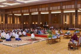 The Paritta Recitation Ceremony for the 1381 Myanmar Era was held at the Presidential Palace in Nay Pyi Taw yesterday morning. President U Win Myint, First Lady Daw Cho Cho and State Counsellor Daw Aung San Suu Kyi were present at the event to listen to the Paritta recitation.