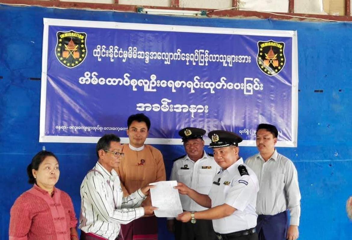 The Myawady Township Immigration and Population Department issued household certificates (66/6) to 54 households who have been living in the new town of Laykaekae after voluntarily returning back from Thailand at Dupalaya BEHS (Laykaekaw) in Myawady Township, Kayin State this morning.