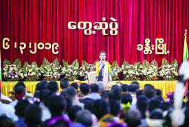 Shwegyin Nikaya Uppaokkahta Abhidaja Maha Rattha Guru Abhidaja Agga Maha Saddhamma Jotika Aggamahā Ganthavacakapaṇḍita Dr. Bhaddanta Nyanissara, Chief Minister of Bago Region U Win Thein, Commander of the Southern Command Maj-Gen Myo Win and officials unveiled the statue and sprinkled scented water on it before posing for a documentary photo.