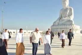 Belarus President Mr Aleksandr Lukashenko, Acting President of the Republic of the Union of Myanmar and SSPC Chairman Senior General Min Aung Hlaing pay homage to Maravijaya Buddha Image