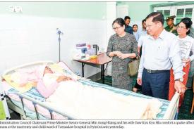 SAC Chairman Prime Minister Senior General Min Aung Hlaing, wife Daw Kyu Kyu Hla look into health conditions of earthquake-affected Tatmadaw members, families and police members at Tatmadaw hospital in PyinOoLwin