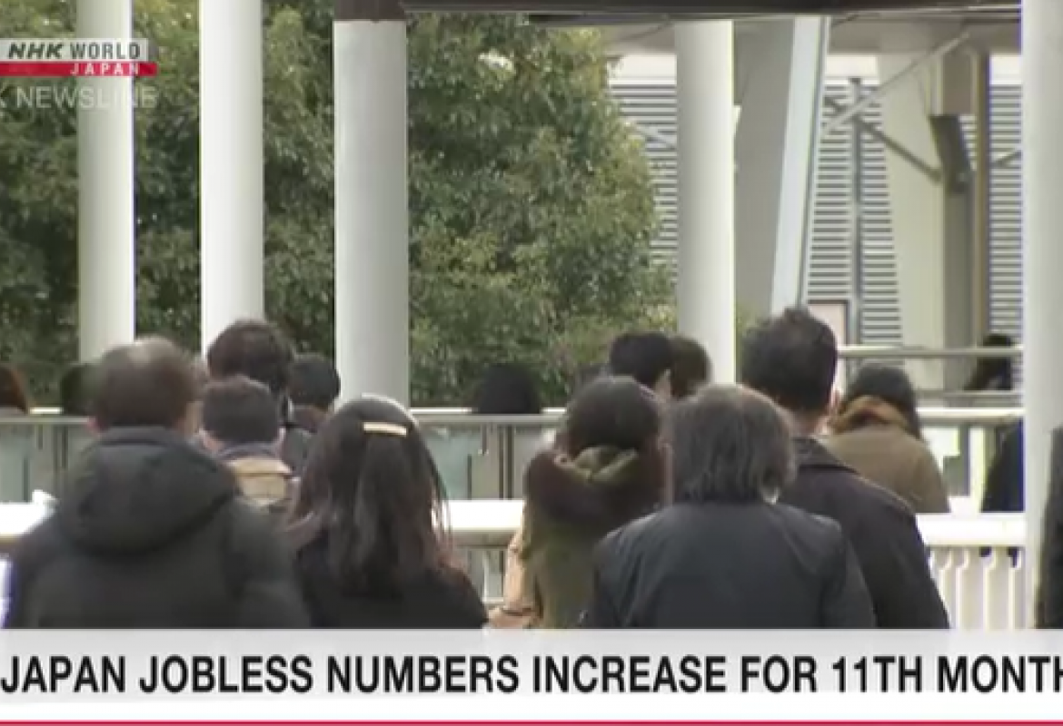 The latest data from the Japanese government shows that the number of people out of work grew by 490 thousand in December compared with a year earlier.
