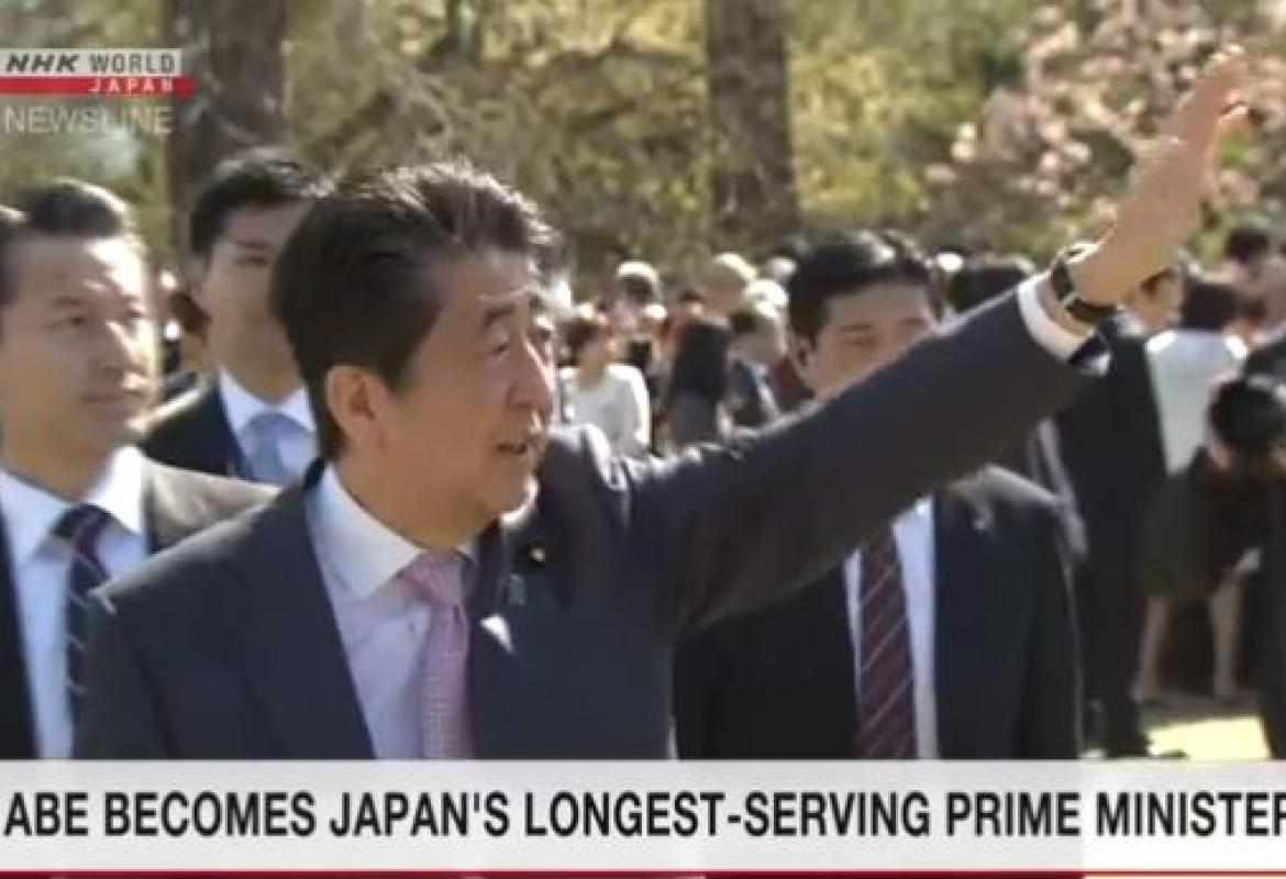 Japanese Prime Minister Shinzo Abe's total tenure has tied the country's record for the longest-serving prime minister, set more than a century ago by Taro Katsura.