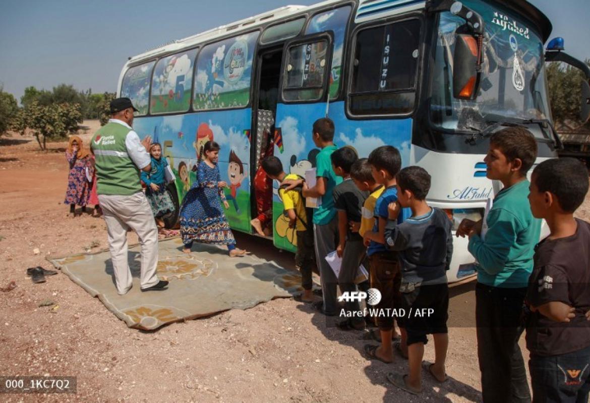Near the village of Hazano in northwestern Syria, children come running through the olive groves every morning to meet the bus that brings school to their improvised tented camp.