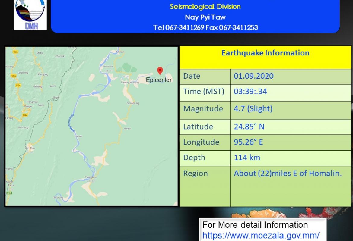 No casualties were reported following a slight earthquake with the magnitude of 3.8 on the Richter Scale with its epicenter inside Myanmar about 2 miles southwest of Homalin---