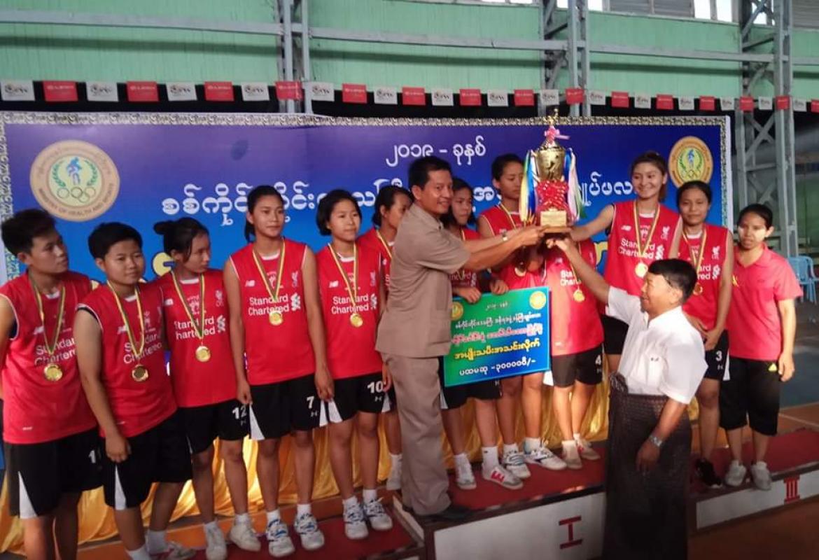 The final match of the Sagaing regional minister’s trophy U-25 men’s and women’s volleyball tournament for 2019 took place in conjunction with a prize awarding ceremony at an indoor stadium in Monywa City on 5 May.