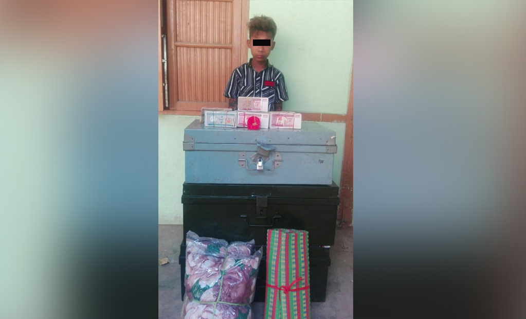 Shortly after receiving the information, the police managed to arrest the teenager in front of “Ngwe Nan Soe” tea shop on Taungdwingyi-Magway road in the town of Taungdwingyi together with stolen items. The authorities seized a gold necklace, a pair of earrings, two pillows, an iron box and a plastic map in his possession.